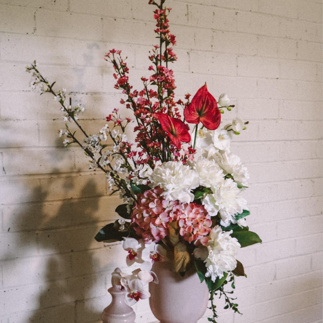Blossom offers a diverse and elegant arrangement of flowers to dress up any space. With a variety of vibrant colors and blooming, high-quality flowers like hydrangeas, cherry blossoms, orchids, and peonies, this arrangement is an instant eye-catcher. Plus, with added touches of apple blossom sprigs, Anthurium lilies, hanging berries, and magnolia leaves, this bouquet provides a unique and luxurious touch to your decor.