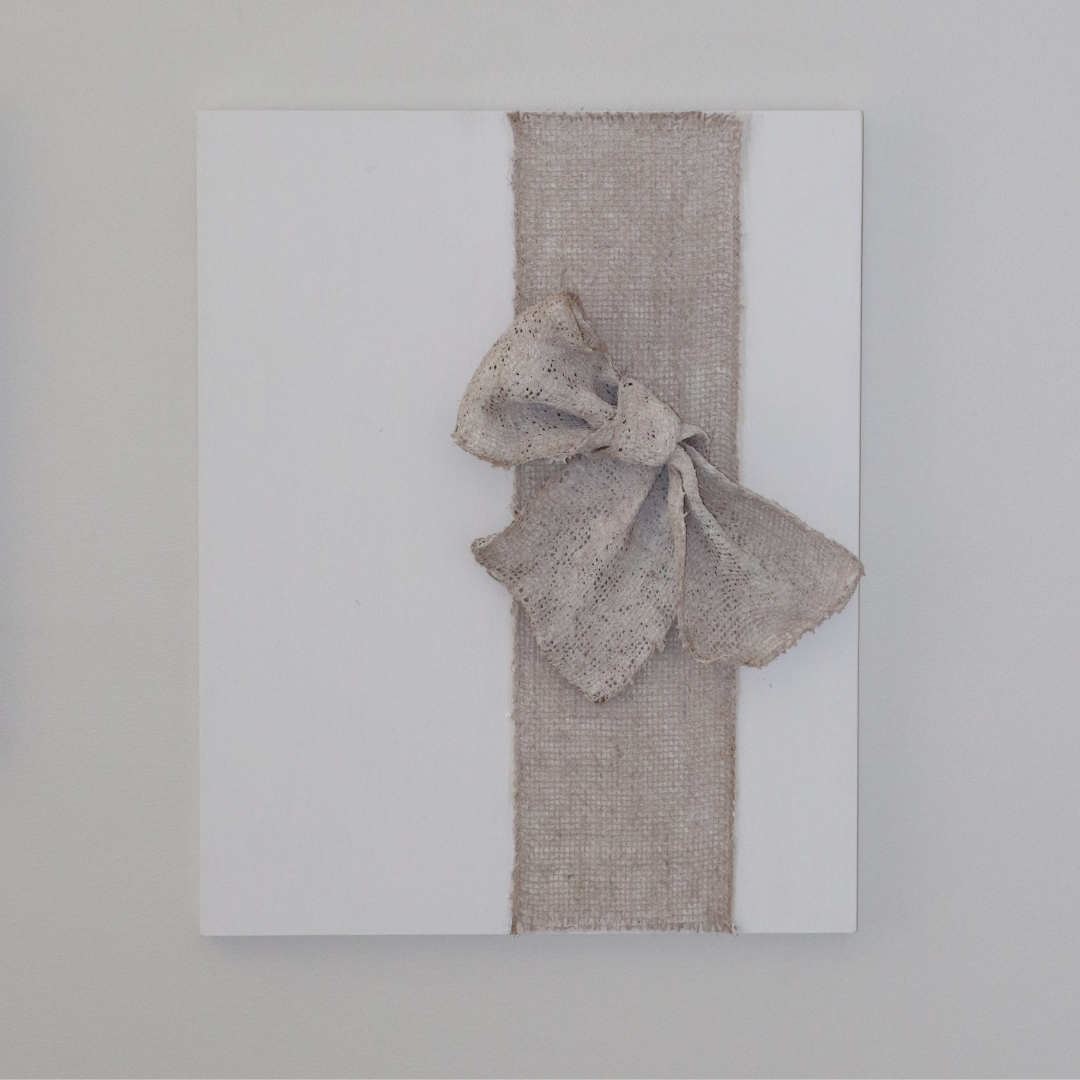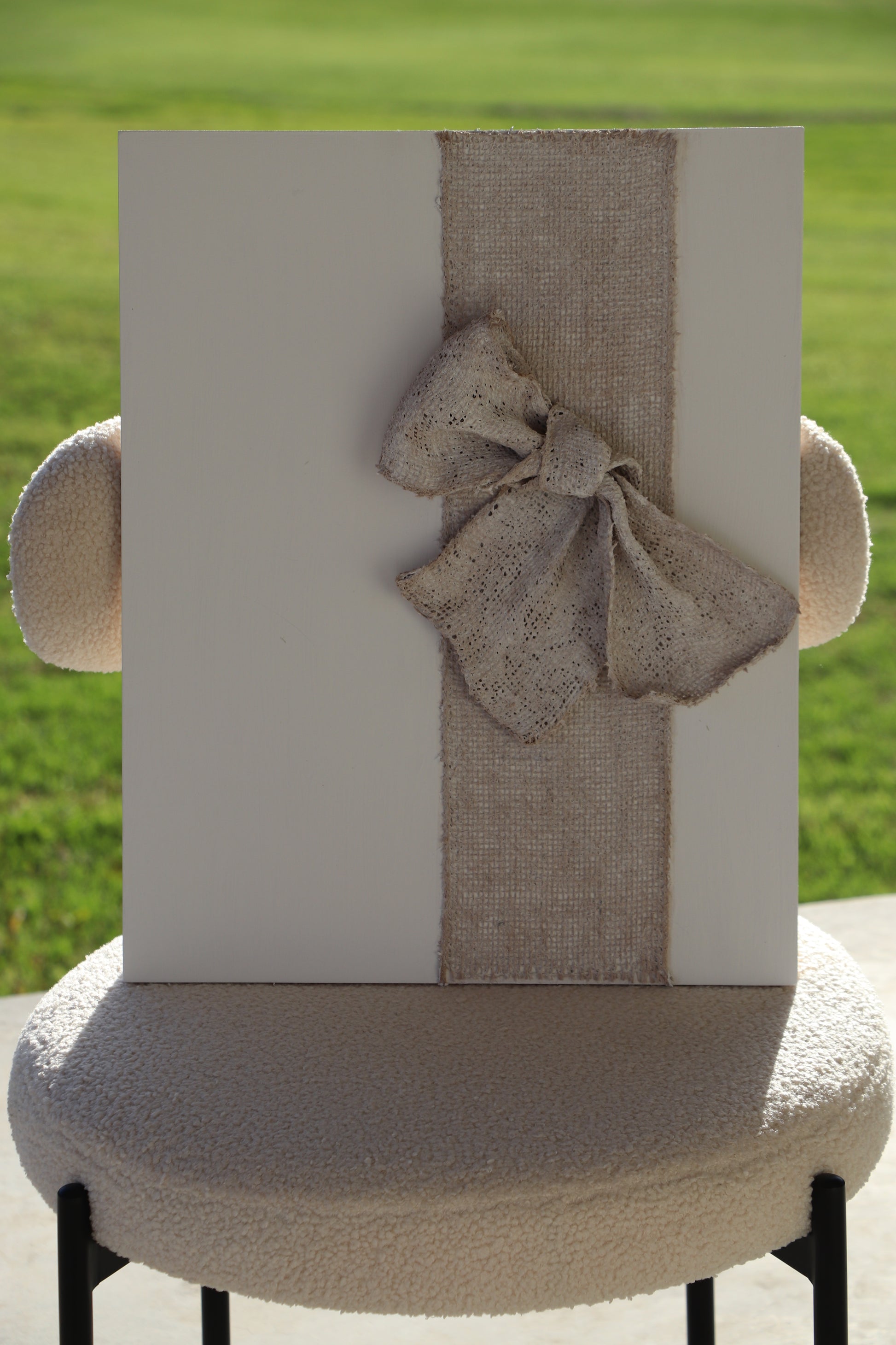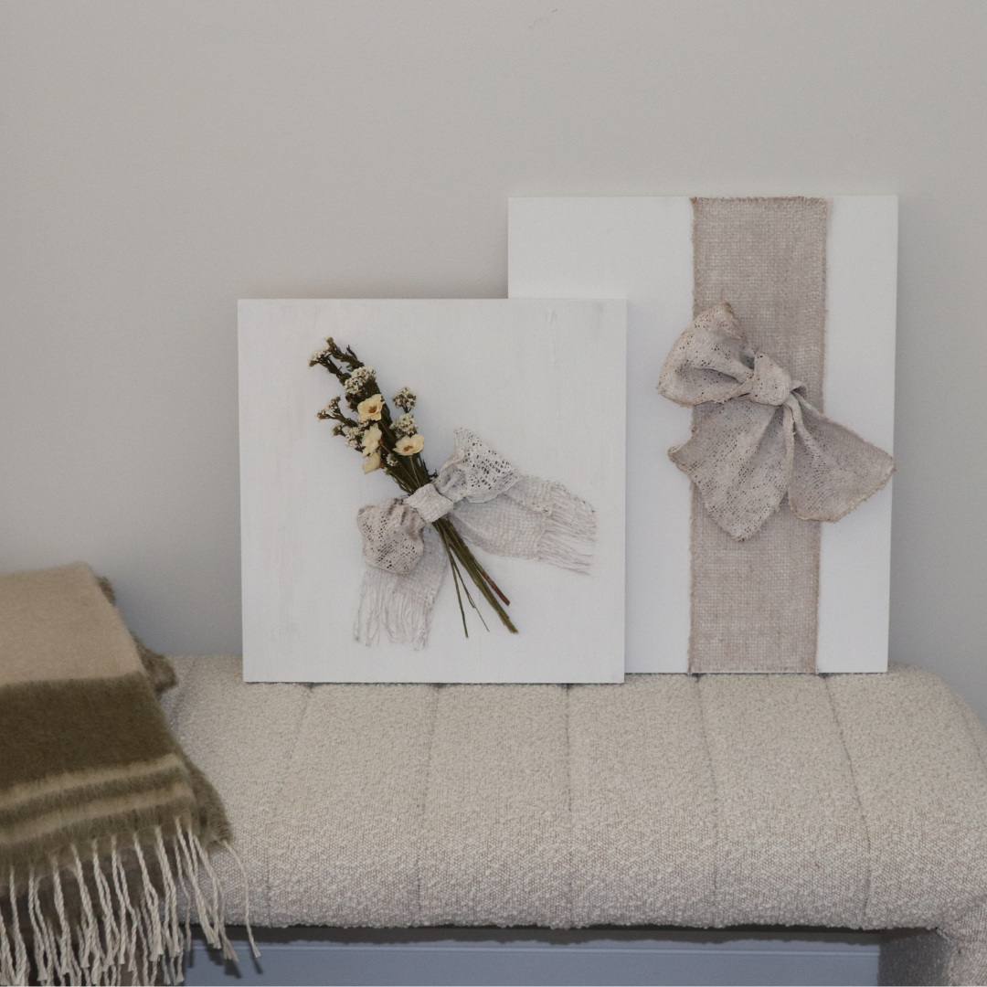 Add a touch of charm with Harper, a playful 3D wall art featuring a simple beige hessian bow against a crisp white background. This delightful piece brings texture and whimsy to your walls, perfect for brightening up any space with a minimal stylish vibe.